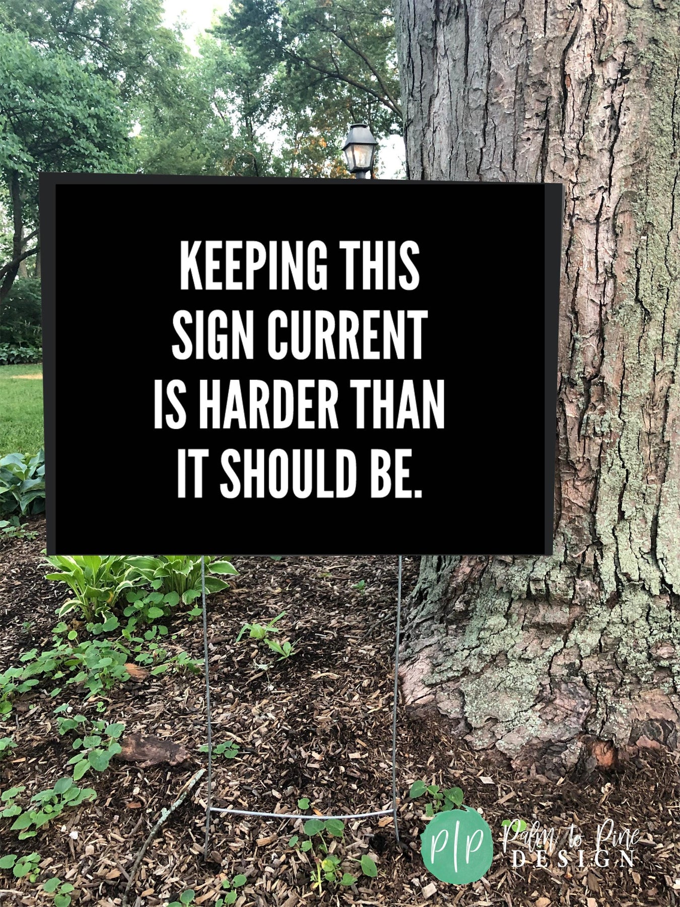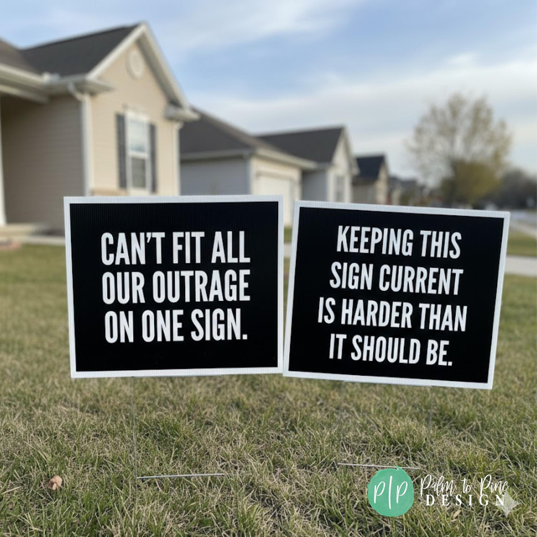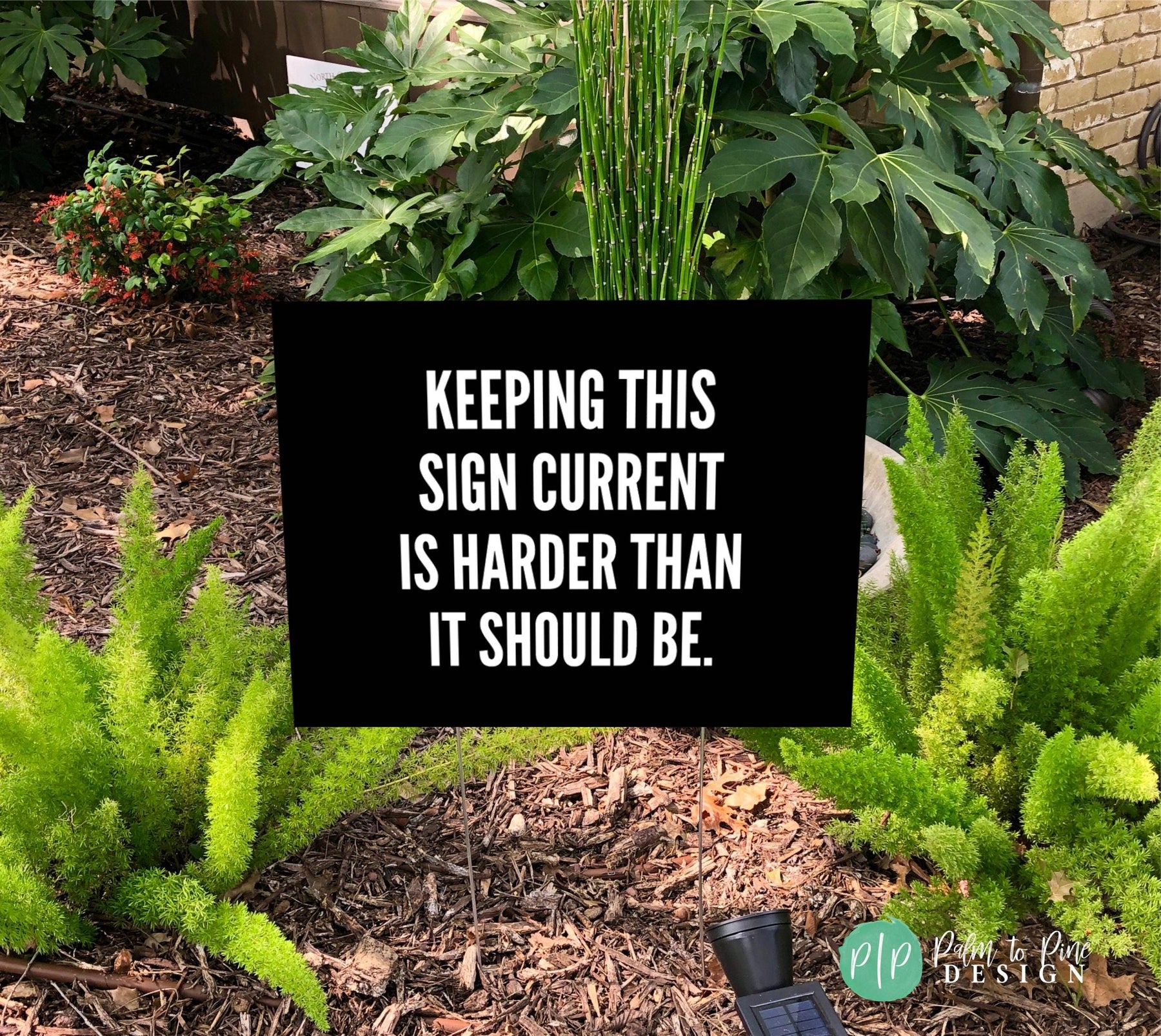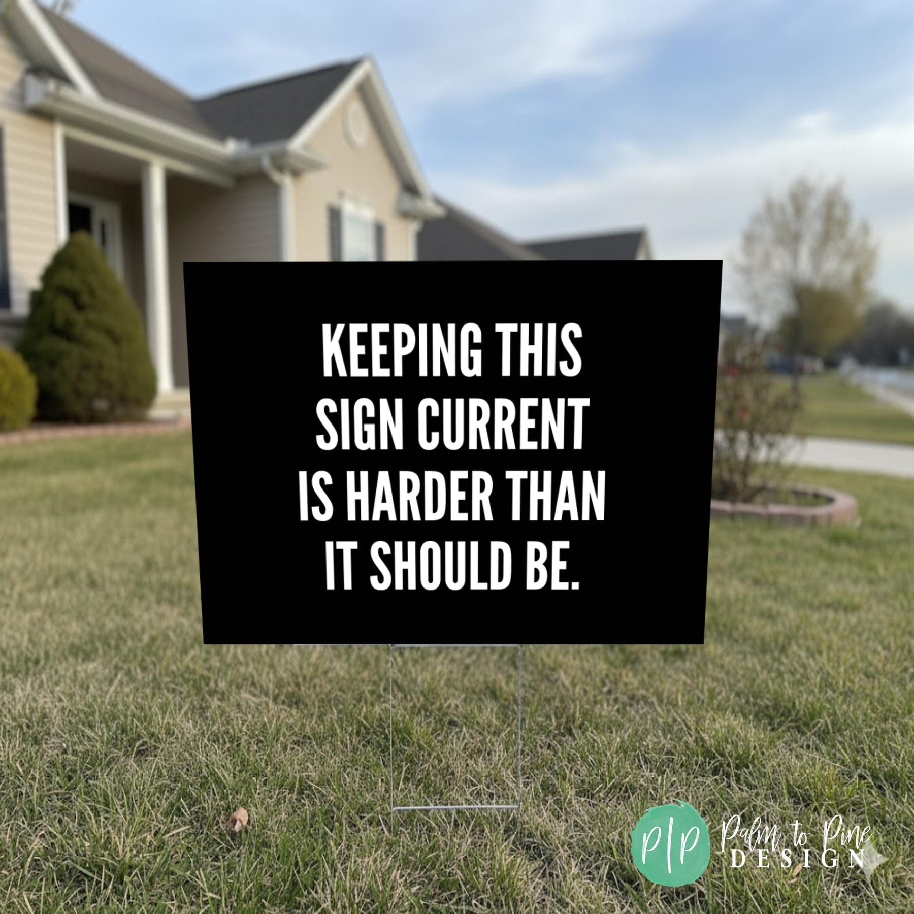 This social justice yard sign is designed for those who want their democratic values clearly seen and awareness raised in a witty, thought provoking way. Featuring the bold black and white message, “Keeping this sign current is harder than it should be,” this political yard sign makes a powerful statement whether displayed in your yard, at a protest, or during a rally. From calls for compassion around immigration and the belief that no human is illegal, to standing in solidarity with Black Lives Matter and advocating for inclusive, equitable education, this sign reflects a shared desire for dignity, fairness, and accountability in an ever-changing political climate. It offers a meaningful way to show support for social justice causes while encouraging thoughtful dialogue and awareness.