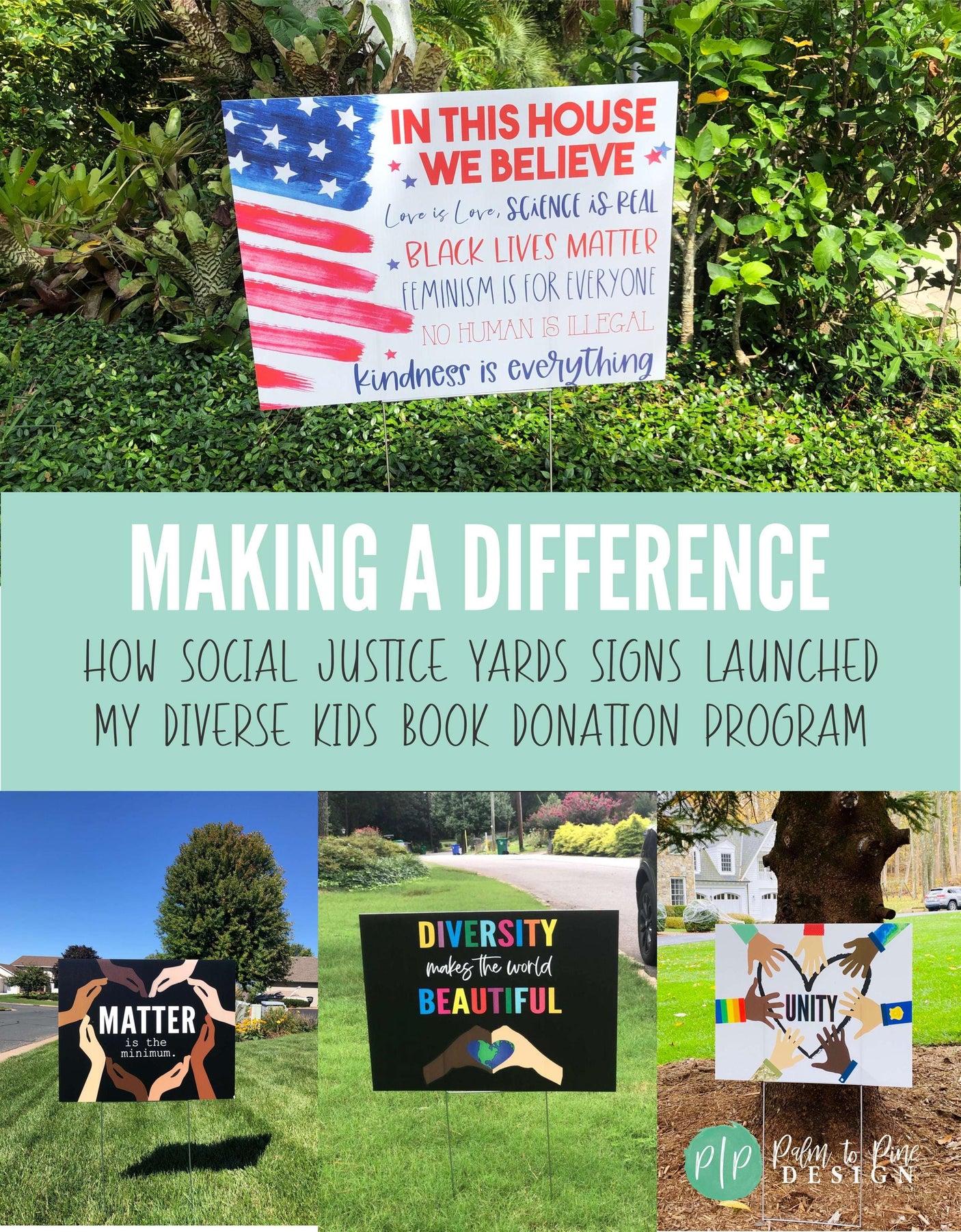 How social justice yard signs lead to a diverse kids book donation program featuring images of political yard signs supporting BLM