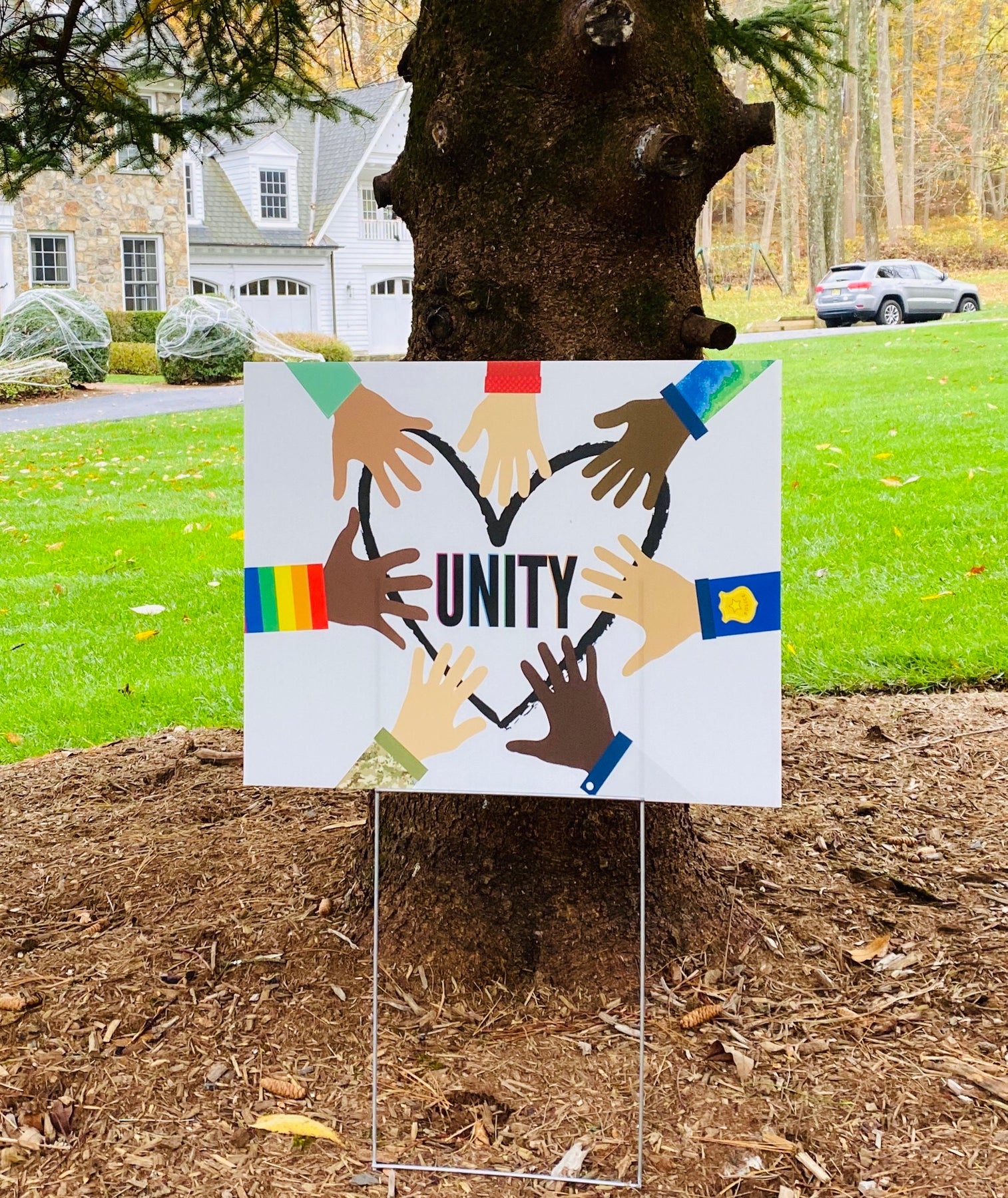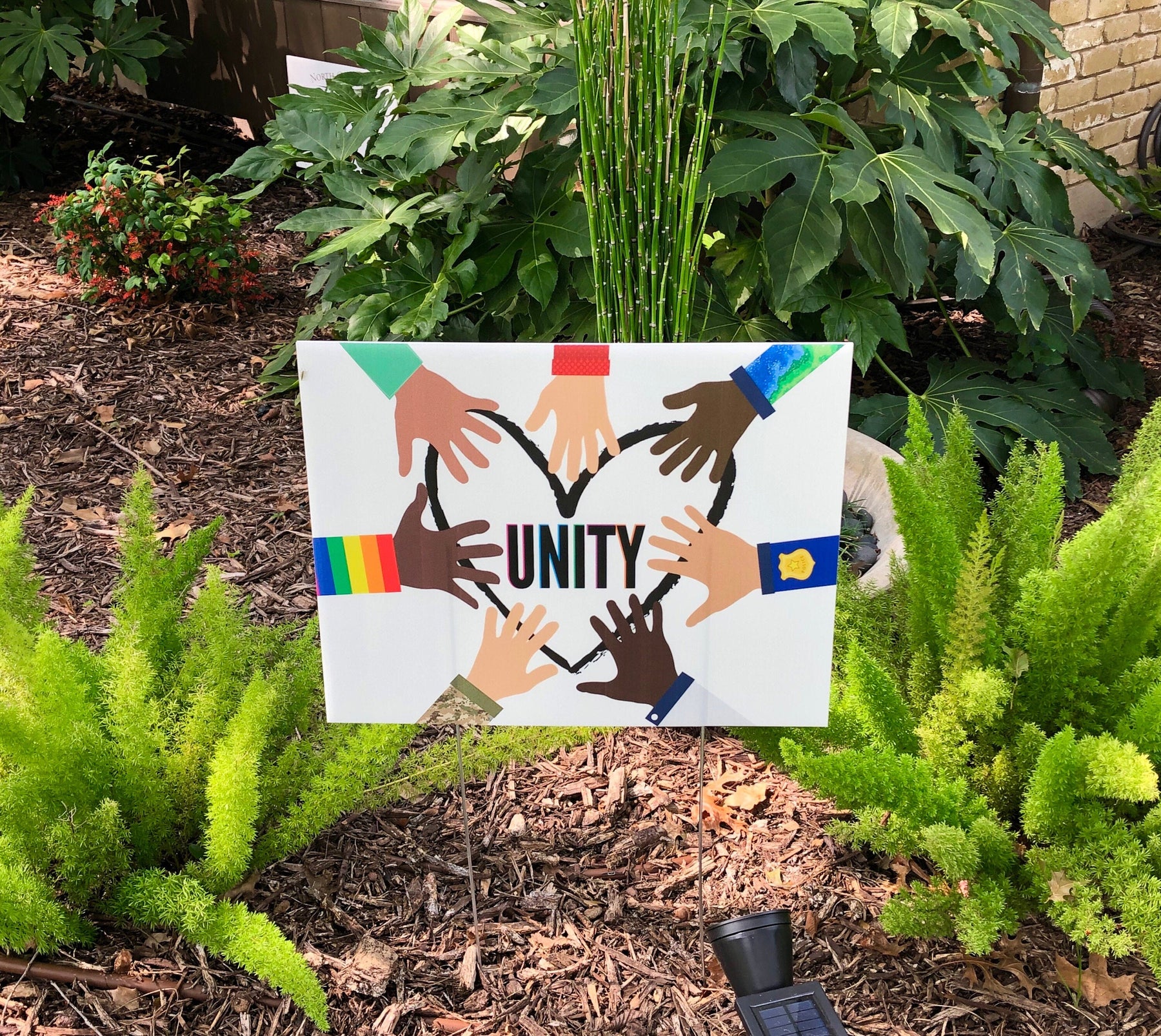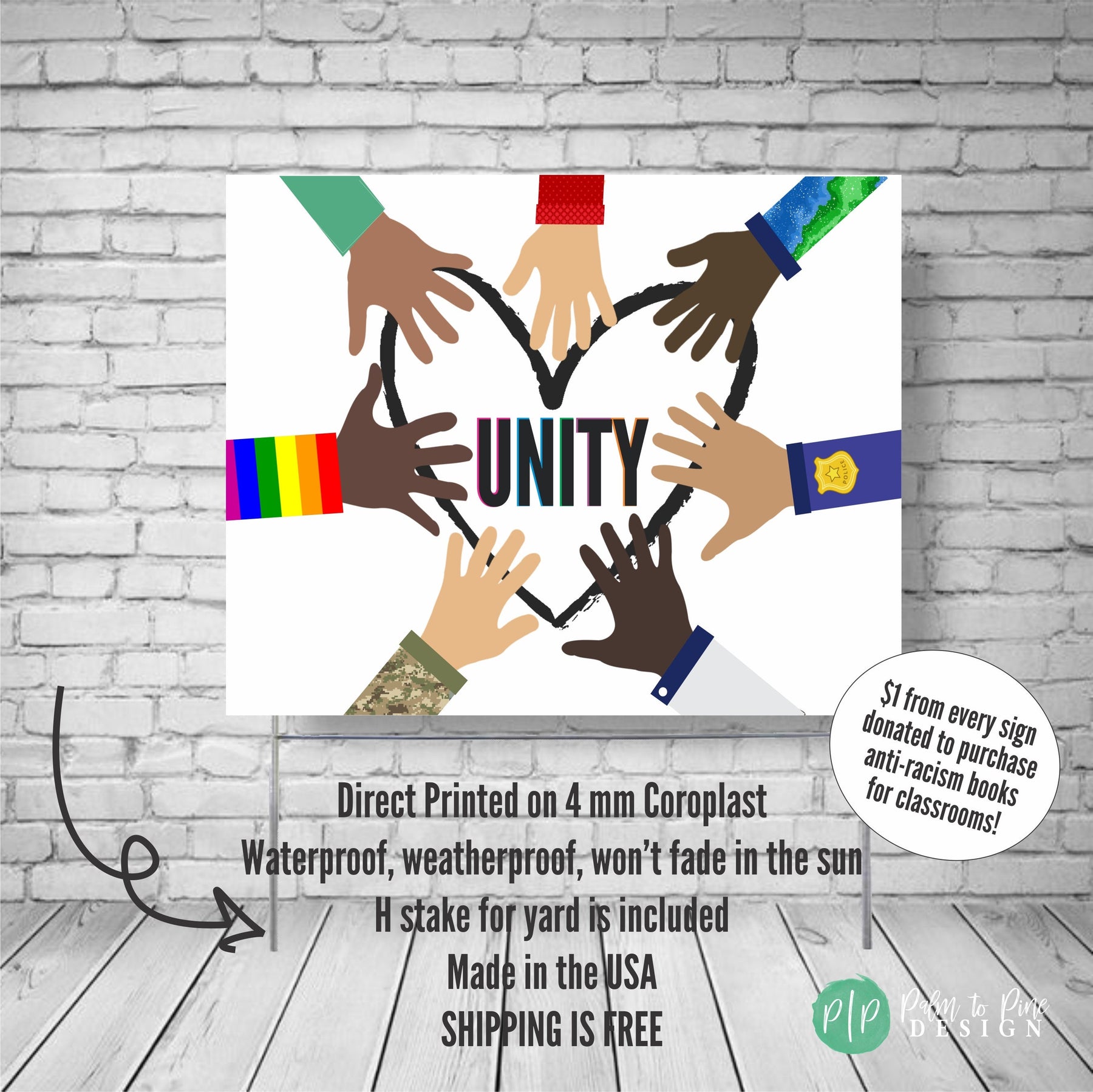 This social justice yard sign proudly displays a message of unity, peace and love conquering hate for all humans. Together, we rise and when we use our voices to show kindness and support for the black lives matter movement, LGBTQ rights, back the blue, our military, doctors and all people, justice, equality and change can happen. This love thy neighbor, positive message sign can be displayed outdoors in the yard, carried at protests, marches or rallies or hung from cars or storefronts. The 4 mm coroplast is printed directly onto the material, so it will not fade in the sun and is 100% waterproof.