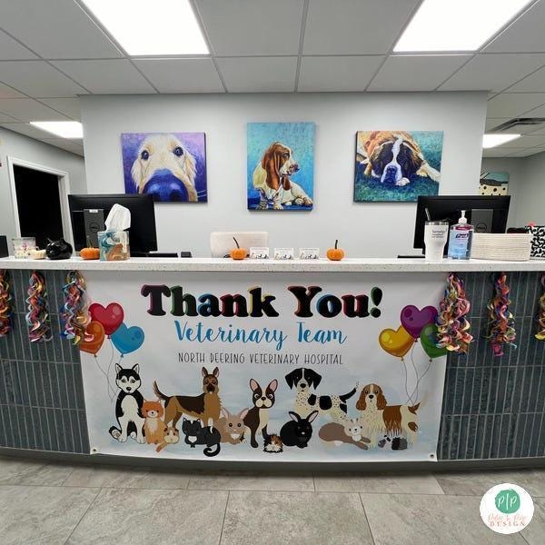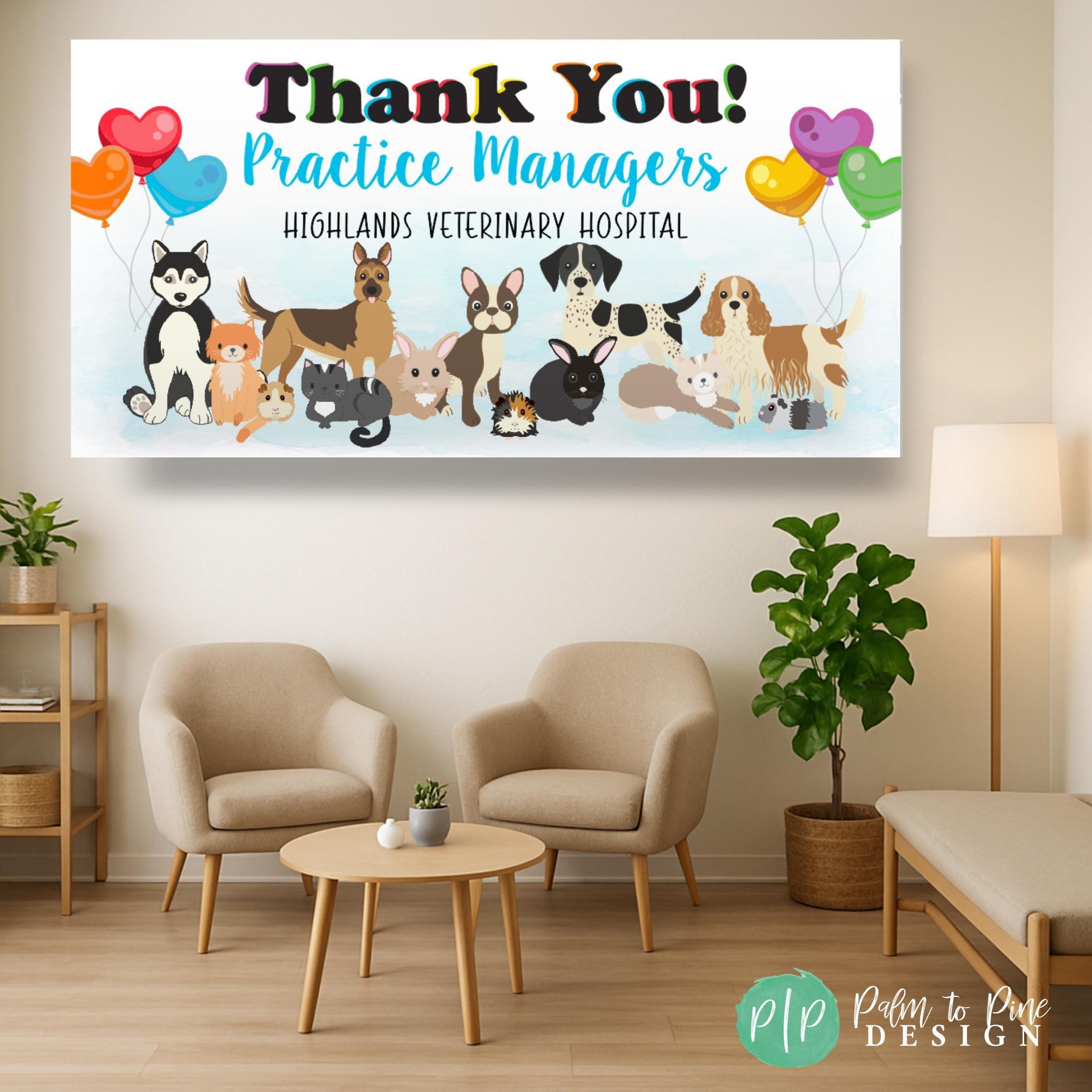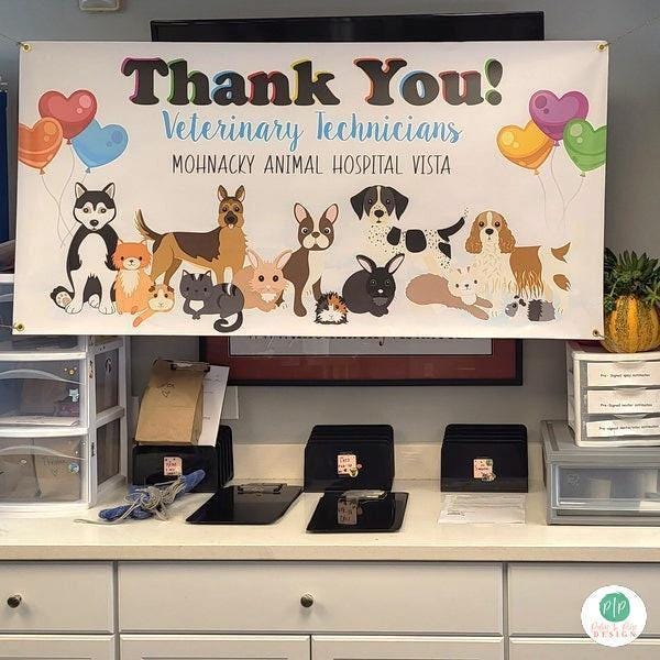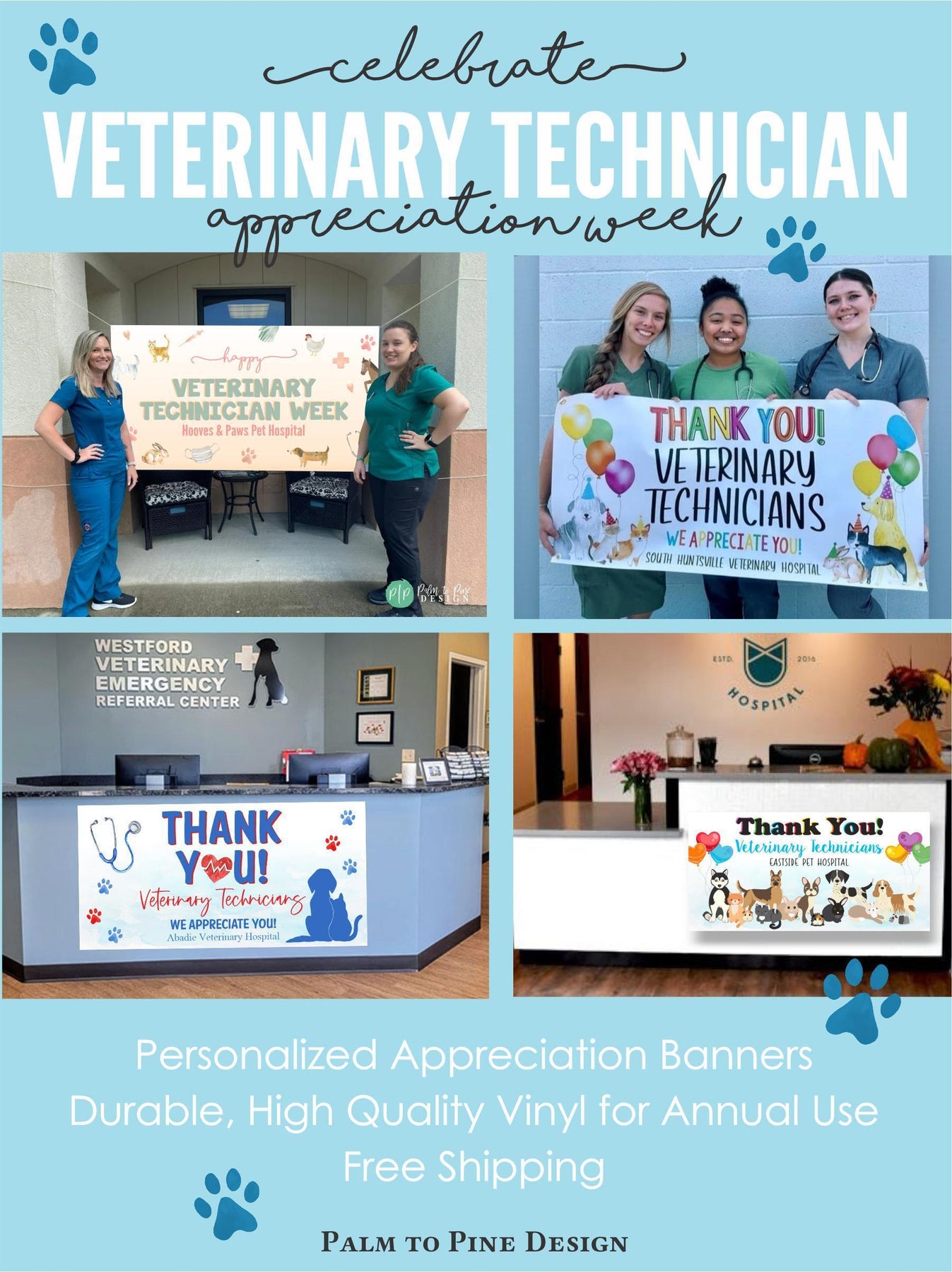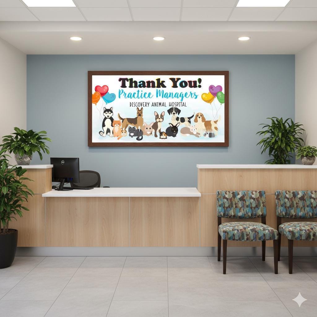 Say Thank You to your Veterinary Staff with a personalized Veterinarian Appreciation Banner for any occasion! Recognize the hard work of Practice Managers, CSR appreciation, Veterinary Assistants, Vet Techs etc. This high-quality vinyl banner is the perfect way to acknowledge the dedication and care that your staff and coworkers bring to their profession. It's more than just a gift, it is a heartfelt thank you.