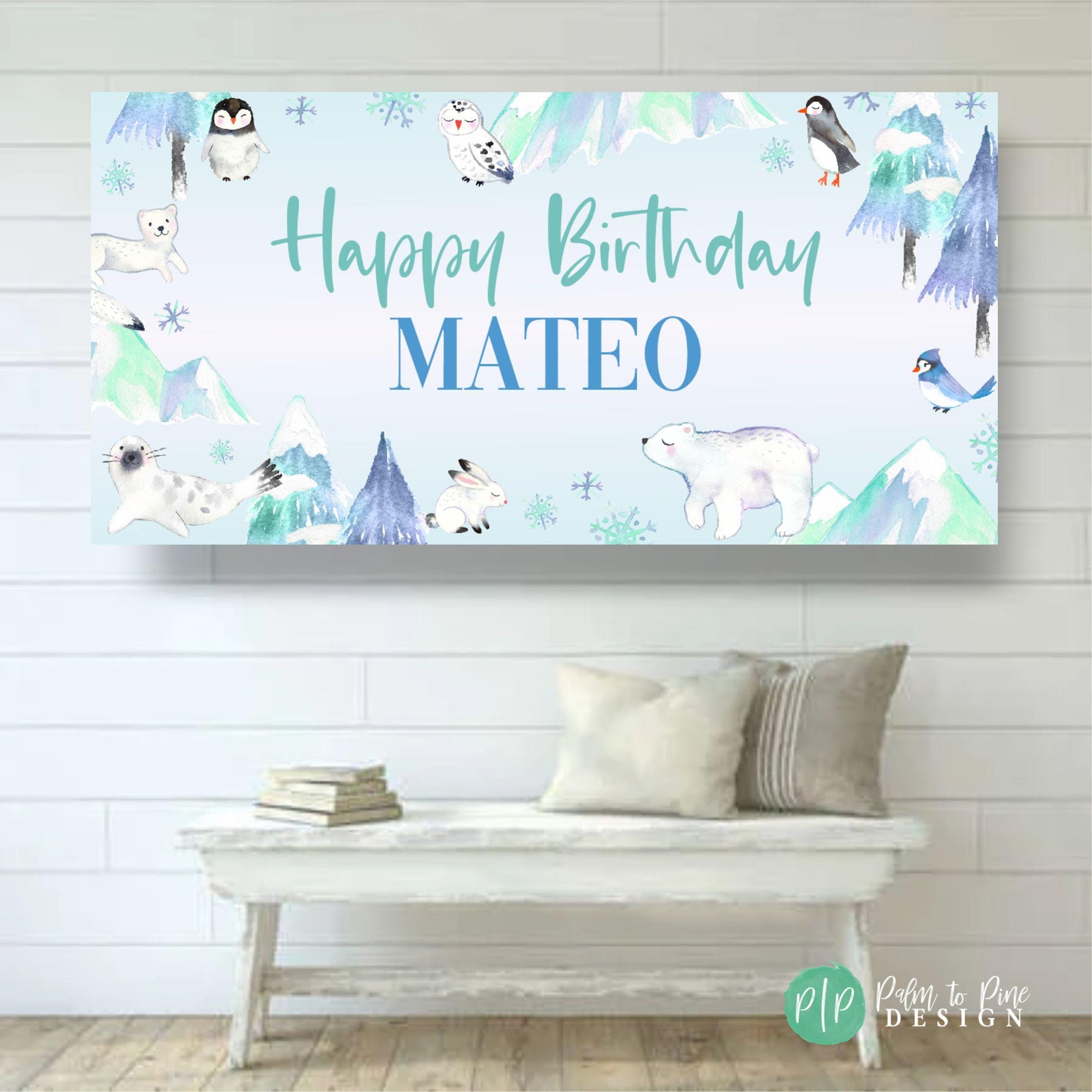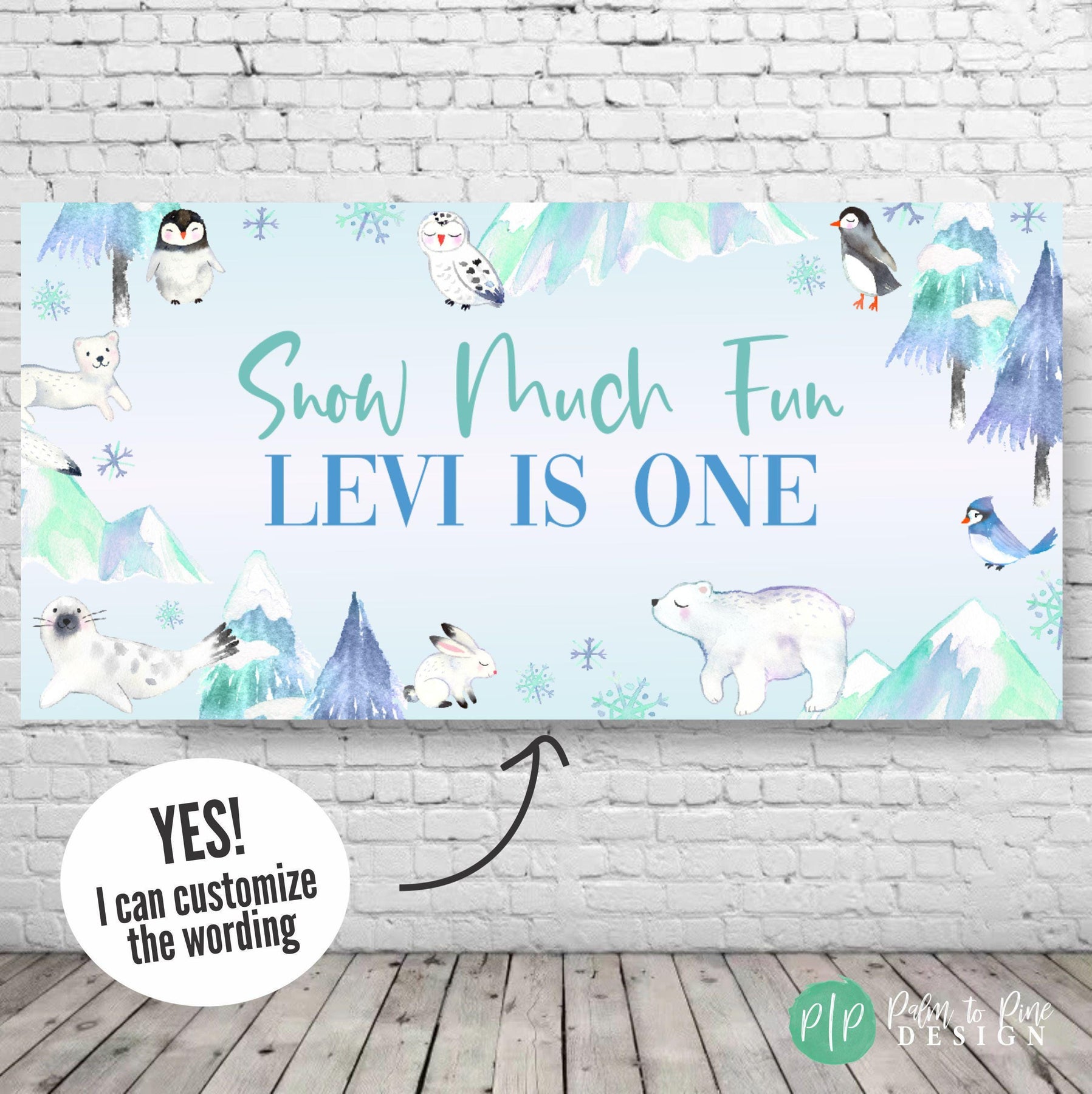 This Winter banner is perfect for a winter Onederland or arctic polar themed birthday party for kids! The festive blue and green banner with snowflakes, snowy mountains, trees and watercolor penguin, bunny, owl and polar bears are the perfect decoration for your winter birthday or boys baby shower! Use this durable vinyl banner for a outdoor welcome sign, as a photo backdrop for pictures or this personalized banner makes the perfect decoration for behind a dessert table at a winter polar animal themed birthday party, baby shower or any holiday party you host. YES! The wording and colors can be customized for any age party or wording!